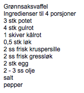 Jeg har tenkt å detoxe huset. Jeg begynte i helgen med å rydde ut av kjøkkenskuffer og -skap som inneholdt krydder, bakevarer etc. Kastet helt enormt mye som hadde gått ut på dato. Ja, det er nok en stund siden det ble gjort sist….. Nå har jeg kvittet meg med krydder, mel, energibarer, granola, pasta, bulgur – en hel haug med stuff jeg har kjøpt inn og trodd jeg kom til å bruke. Nå er en ny æra begynt på mitt kjøkken – jeg skal bare kjøpe inn det jeg faktisk har tenkt å bruke i nær framtid. Og jeg har kjøpt inn sånt jeg kan bake sunt med – sunn granola, sunne knekkebrød, sunne energibarer m.m ;-) Jeg har rett og slett tenkt at med mer tid til disposisjon har jeg tid til å gå tilbake til mitt sunne kosthold. Dvs. mitt mer grunnleggende sunne kosthold. Lage mest mulig selv, basere mest mulig på ferske frukt og grønnsaker, rett og slett være like bevisst som jeg var for noen år tilbake. Og jeg er i gang. Jeg juicer, lager smoothies – og i dag laget jeg grønnsaksvafler, fikk oppskriften fra vår fantastiske kantinedame. De er helt sykt gode, jeg deler gjerne oppskriften med dere: